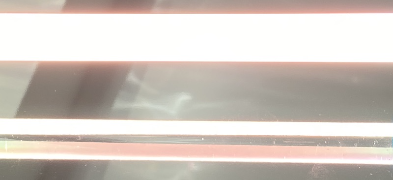 Glasstab mit eingekoppeltem Licht über einem Spiegel – Licht zur Kamera gerichtet